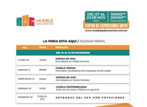 El evento abrirá de 10:00 a 20:00, ofreciendo parqueadero para comodidad del público. El valor de la entrada será de 2 dólares, con descuento del 50% para adultos mayores. Además, la entrada será gratuita para quienes se registren y descarguen su pase desde la página web www.muebleydecoracion.com.ec entre el 15 y 30 de octubre.